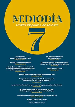 Abarcará temporalmente la producción literaria hispánica desde finales del XIX hasta, aproximadamente, 1950, además de plantear estudios sobre publicaciones, temas y géneros característicos del periodo, cuya salida a la luz podrá servir de descubrimiento para todos aquellos lectores avezados con la suficiente curiosidad intelectual y gusto por nuestras letras. Con el deseo de cumplir esta doble función, aunando en sus páginas la reproducción de textos literarios con la historiografía, nace –o renace– Mediodía. Presentación Álvaro Ceballos Viro »avivo « [ textos literarios ] Alfonso García Morales. Ricardo Rojas: «La obra de Rubén Darío» (1908) Jesús Rubio Jiménez. Un «Palique» y un dibujo olvidados de Clarín. Leopoldo Alas Clarín, «Pali-que» Carmen de Mora Valcárcel. Salarrué y sus Cuentos de barro. Salarrué, «La botija» Miguel Soler Gallo. Carmen de Burgos y la literatura infantil: dos desconocidos cuentos de Re-yes Magos. Carmen de Burgos, «Dos desconocidos cuentos de Reyes Magos» Miguel Ángel Buil Pueyo. Julio [de] Hoyos, el bohemio acomodado: su adaptación teatral de Nada menos que todo u «,